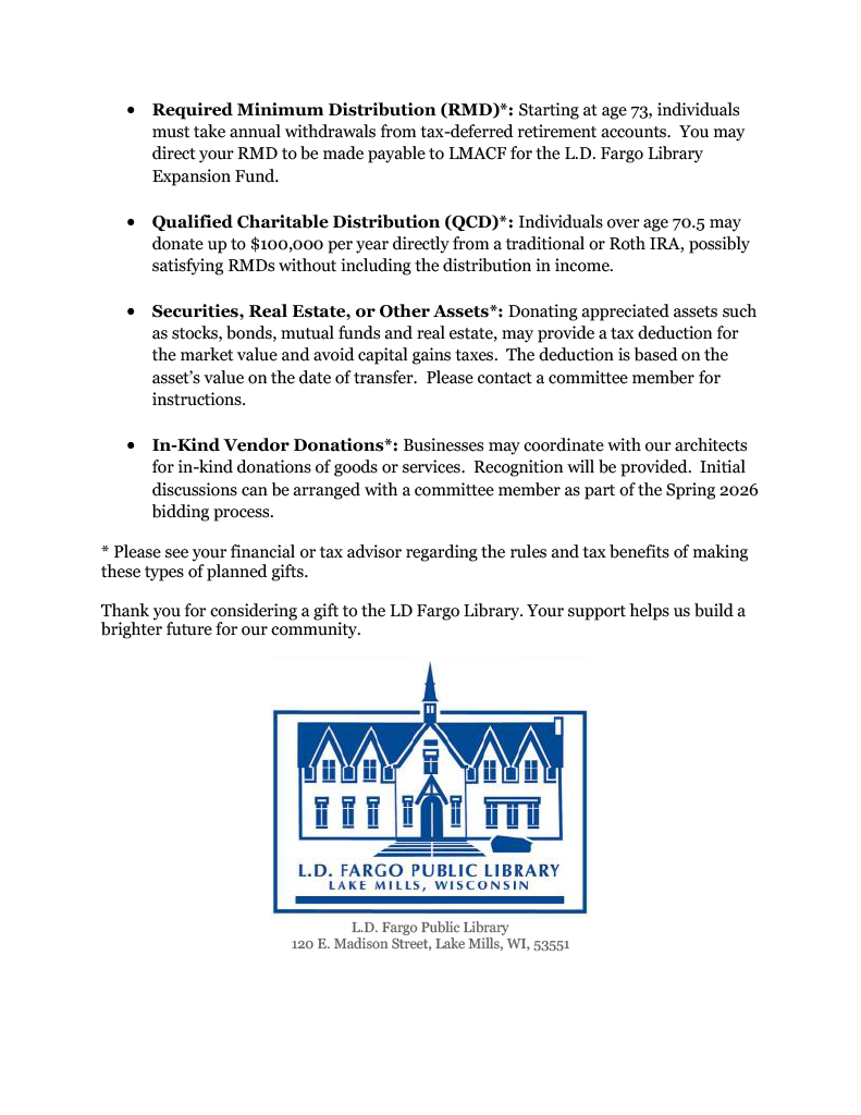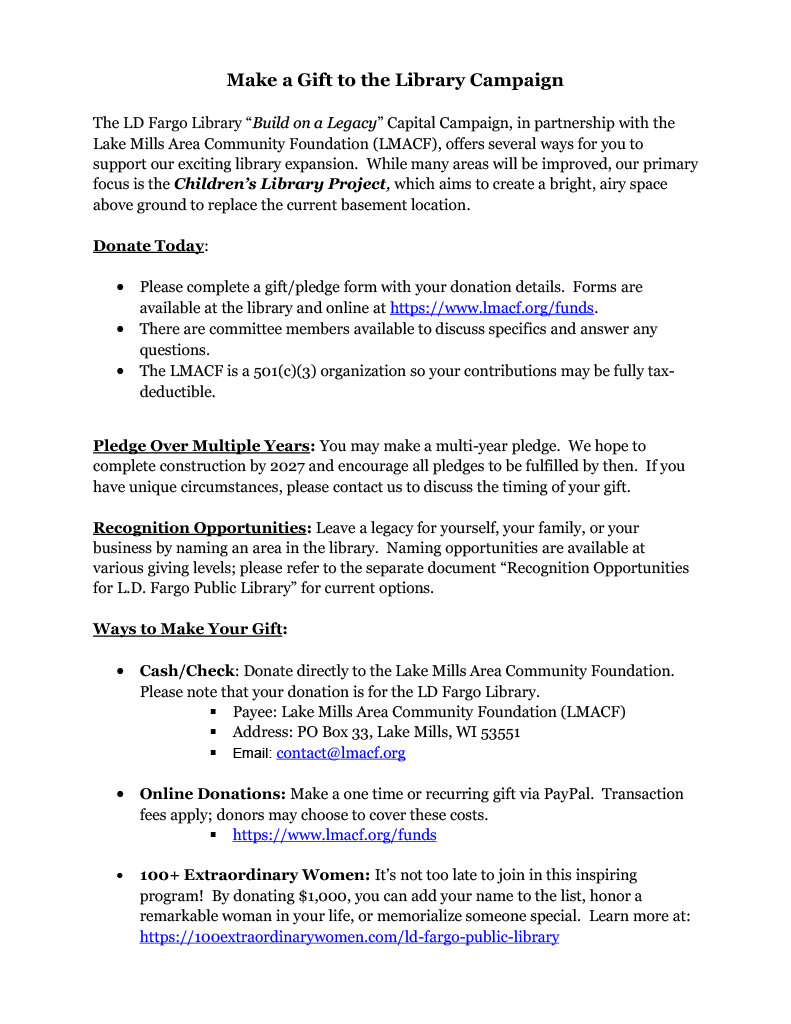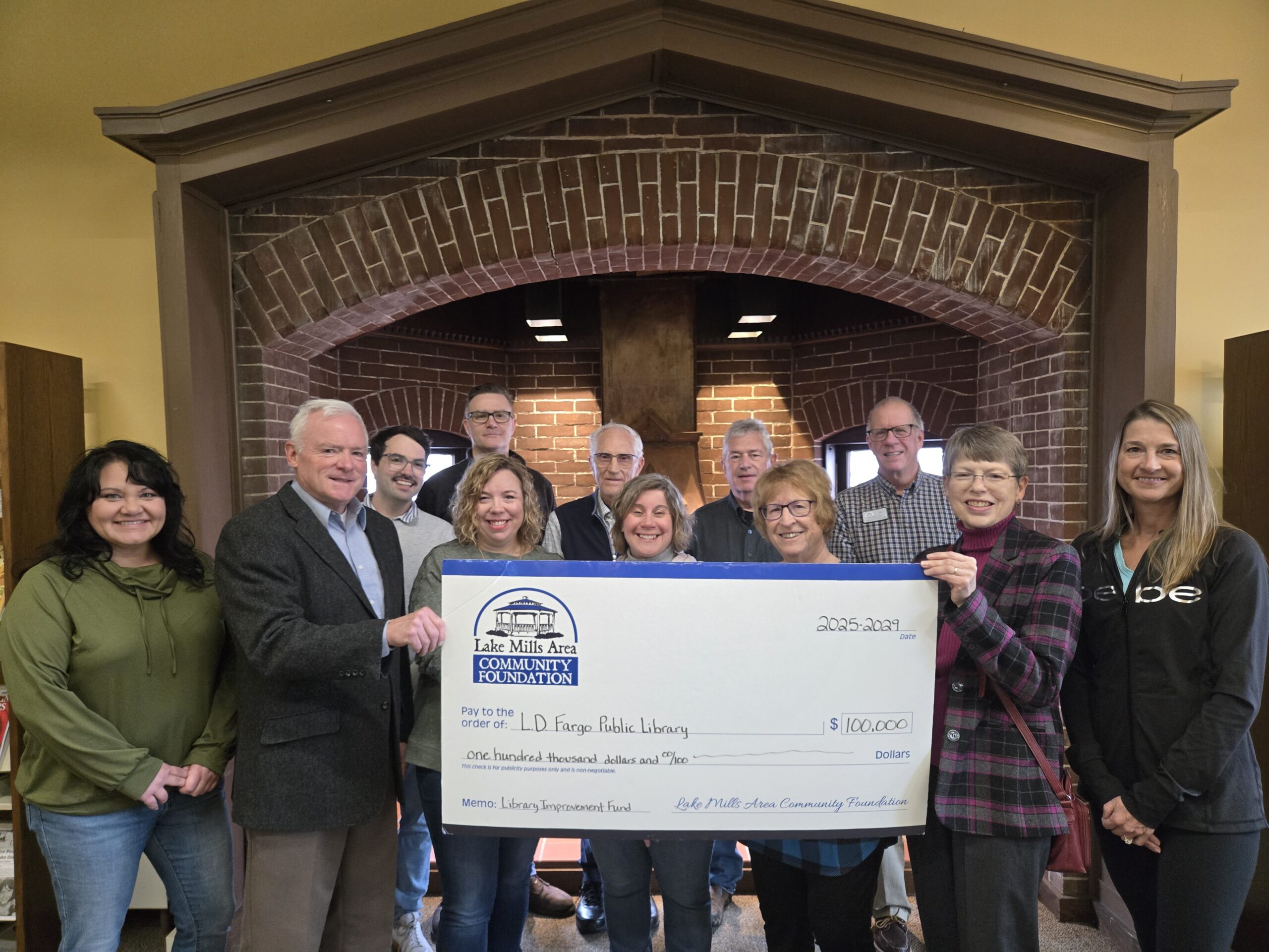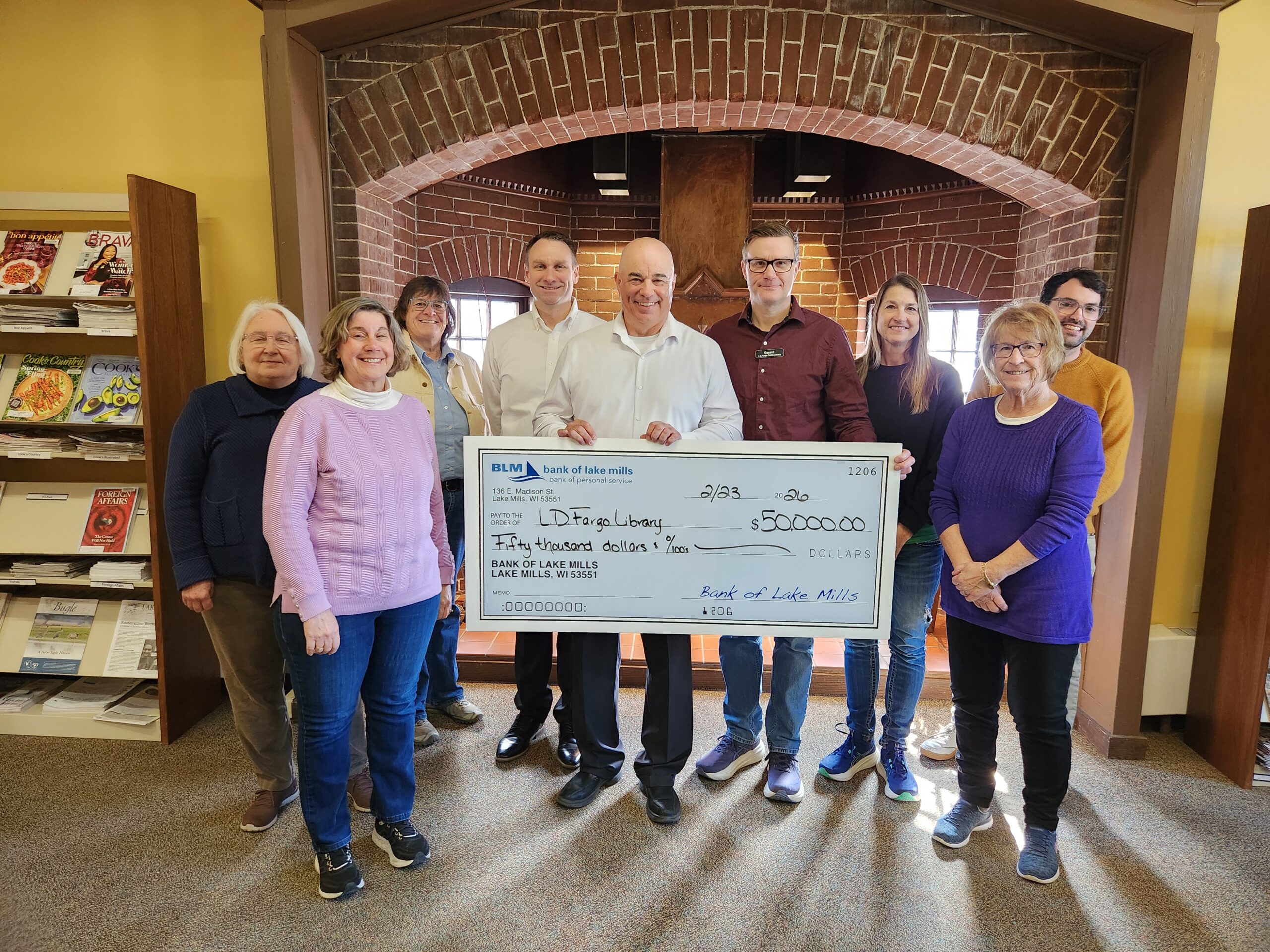 Bank of Lake Mills $50,000 donation to the library expansion.